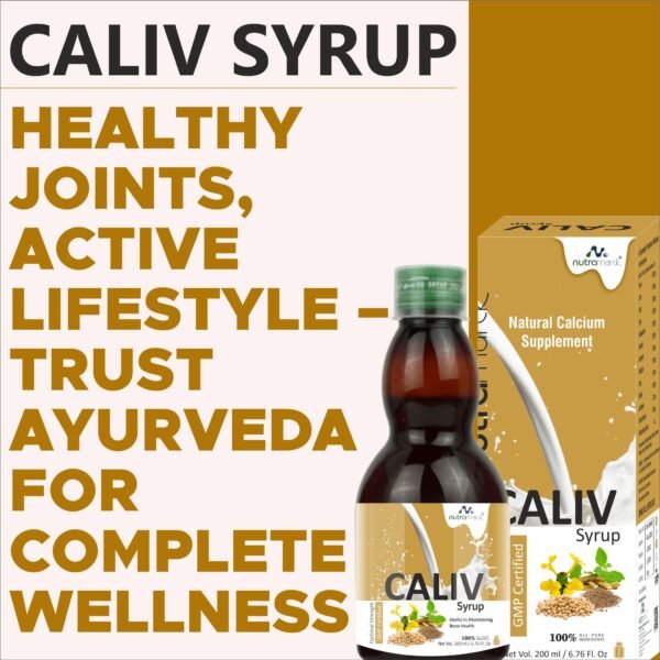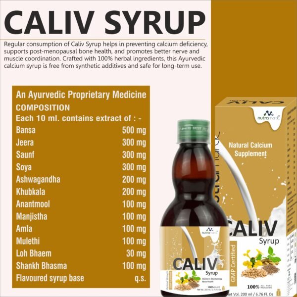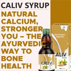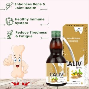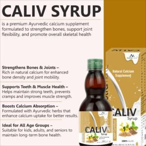 Caliv Syrup is a premium Ayurvedic calcium supplement formulated to strengthen bones, support joint flexibility, and promote overall skeletal health. Enriched with natural calcium sources and powerful Ayurvedic herbs, this herbal tonic ensures optimal calcium absorption for stronger bones, healthier teeth, and improved muscle function. It is ideal for all age groups, including growing children, adults, and elderly individuals experiencing bone weakness.