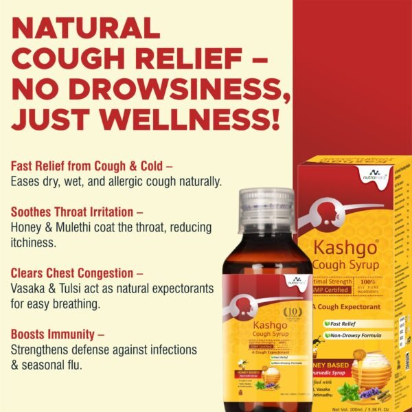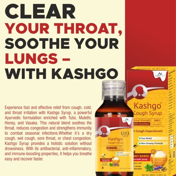 Whether it’s a dry cough, wet cough, sore throat, or chest congestion, Kashgo Syrup provides a holistic solution without drowsiness or side effects. With its antibacterial, anti-inflammatory, and immune-boosting properties, it helps you breathe easy and recover faster.