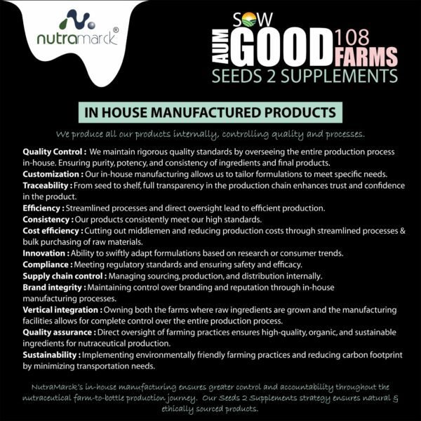 ✔ IN HOUSE MANUFACTURED PRODUCT : We produce all our products internally, controlling quality and processes. Nutramarck’s in-house manufacturing ensures greater control and accountability throughout the nutraceutical farm-to-bottle production journey. Our seeds 2 Supplements strategy ensures natural § ethically sourced products.