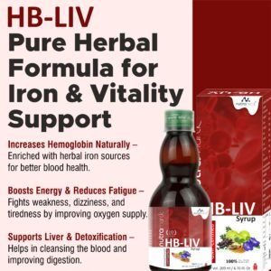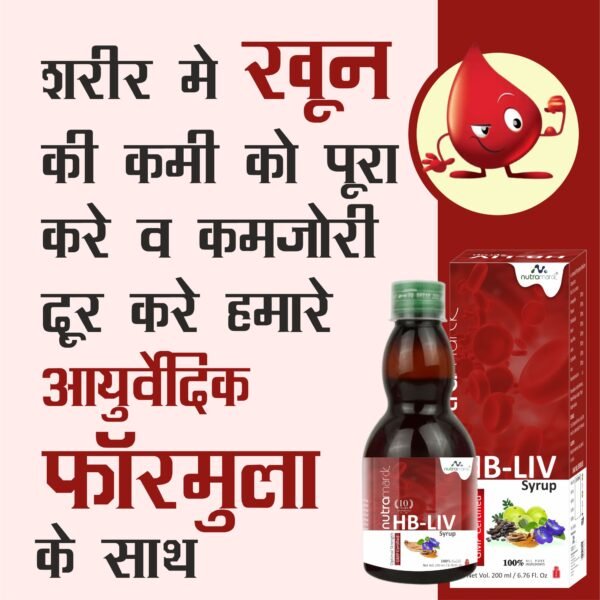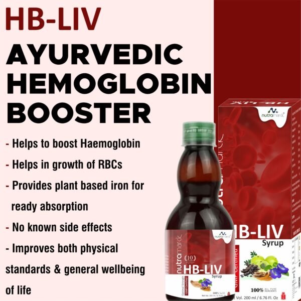 NutraMarck HB Liv Syrup is a powerful Ayurvedic formulation designed to naturally boost hemoglobin levels, improve blood circulation, and combat iron deficiency & anemia. Infused with potent herbal extracts, this iron-rich syrup enhances oxygen transport in the body, fights fatigue & weakness, and promotes vitality & energy. HB Liv Syrup also supports liver function, detoxification, and overall well-being. Made with 100% natural ingredients, it is safe, effective, and free from harmful chemicals. Ideal for individuals struggling with low hemoglobin, poor immunity, or tiredness.